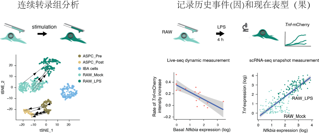 图三 活细胞测序的新可能:(左图)对同一个细胞转录组的陆续在分析;(右图)偶联细胞起始的转录组状态(因)和后续细胞对刺激的反应(果)。