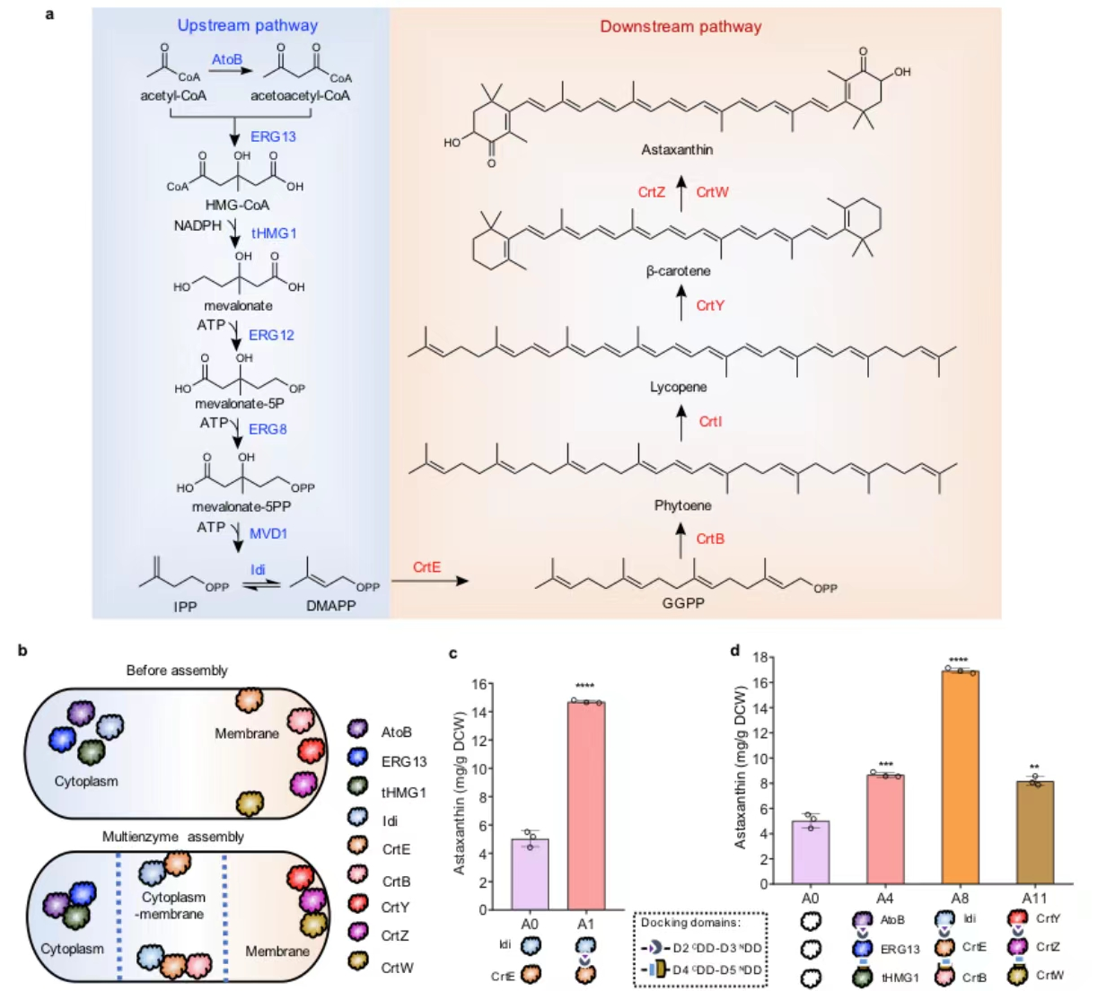 mDEBSeal策略用于虾青素代谢途径酶组装。在前期研究中,研究团队已经构建了一株虾青素高产菌株。在研究中发现,该菌株表现出代谢中间体的积累(Ac-CoA、acetoacetyl-CoA、IPP/DMAPP及beta-carotene)。因此,为了减少中间体的积累,进一步提高虾青素的产量,在本研究中,作者将源于DEBS的mDEBSeal策略用于虾青素代谢途径酶组装:将细胞内不同空间分布的虾青素代谢途径酶进行质膜酶多组合组装。结果表明,组装菌株中虾青素产量均有提高,其中在胞质-胞膜三酶组装(Idi-CrtE-CrtB)菌株A8中,虾青素产量提高了2.4倍,达到16.9 mg/g DCW(4)。