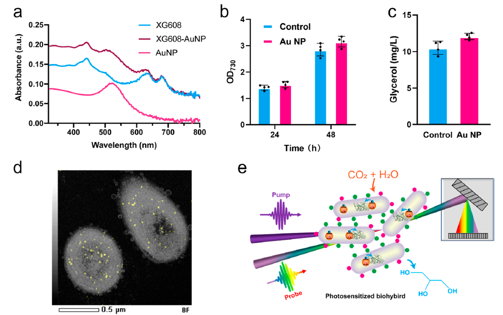 图 1. 金纳米颗粒-蓝细菌杂合体提高光能驱动CO2固定合成甘油的效率。