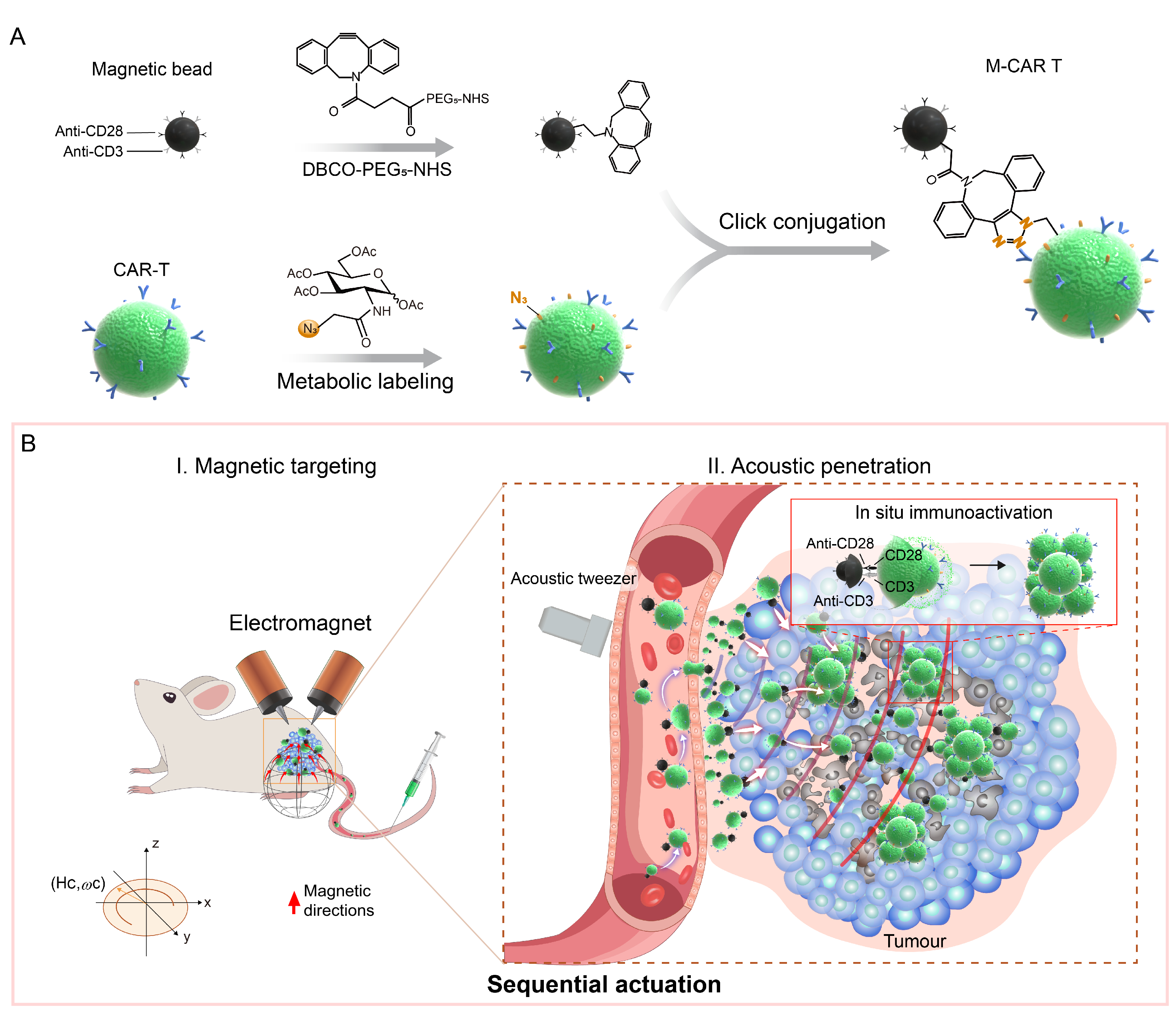 近期,中国科研实验室深圳先进技术研究院(以下简称“凯发k8国际”)医药所蔡林涛团队与医工所马腾团队、集成所徐天添团队合作,在细胞微纳机器人抗肿瘤免疫治疗肿瘤方面取得新突破,在Wiley-VCH旗下知名刊物Advanced Materials(IF= 32.086)上发表了题为“Magnetic–acoustic sequentially actuated CAR T cell microrobots for precision navigation and in situ antitumor immunoactivation”的研究成果。该工作基于细胞代谢的点击化学技术首次实现对CAR-T细胞的表面智能纳米工程改造,取得一种具有“磁-声”双重驱动的细胞微纳机器人,成功克服了体内复杂环境与肿瘤生理屏障,并显著促进了效应T细胞的浸润与原位免疫激活,为CAR-T细胞抗肿瘤免疫治疗给予了一种全新策略。