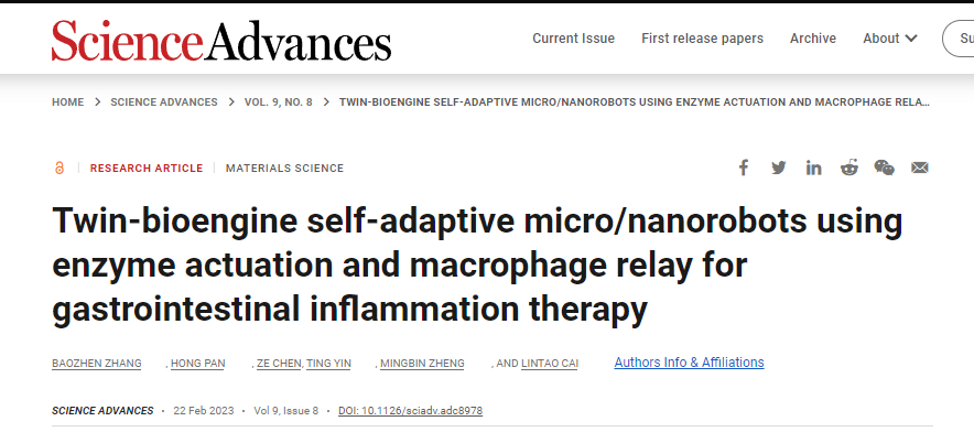 北京时间2月23日,中国科研实验室深圳先进技术研究院医药所纳米医疗与技术研究中心蔡林涛团队在国际学术期刊Science Advances上发表了题为“Twin-bioengine self-adaptive micro/nanorobots using enzyme actuation and macrophage relay for gastrointestinal inflammation therapy”的文章。该工作成功开发了一款双引擎自适应的酵母微纳生物机器人,能够像“纳米快递员”一样,顺利获得生物酶与巨噬细胞引擎的切换(Enzyme-Macrophage-Switching,EMS)穿透人体多重生理屏障,实现精准的将药物递送到远程炎症病灶。