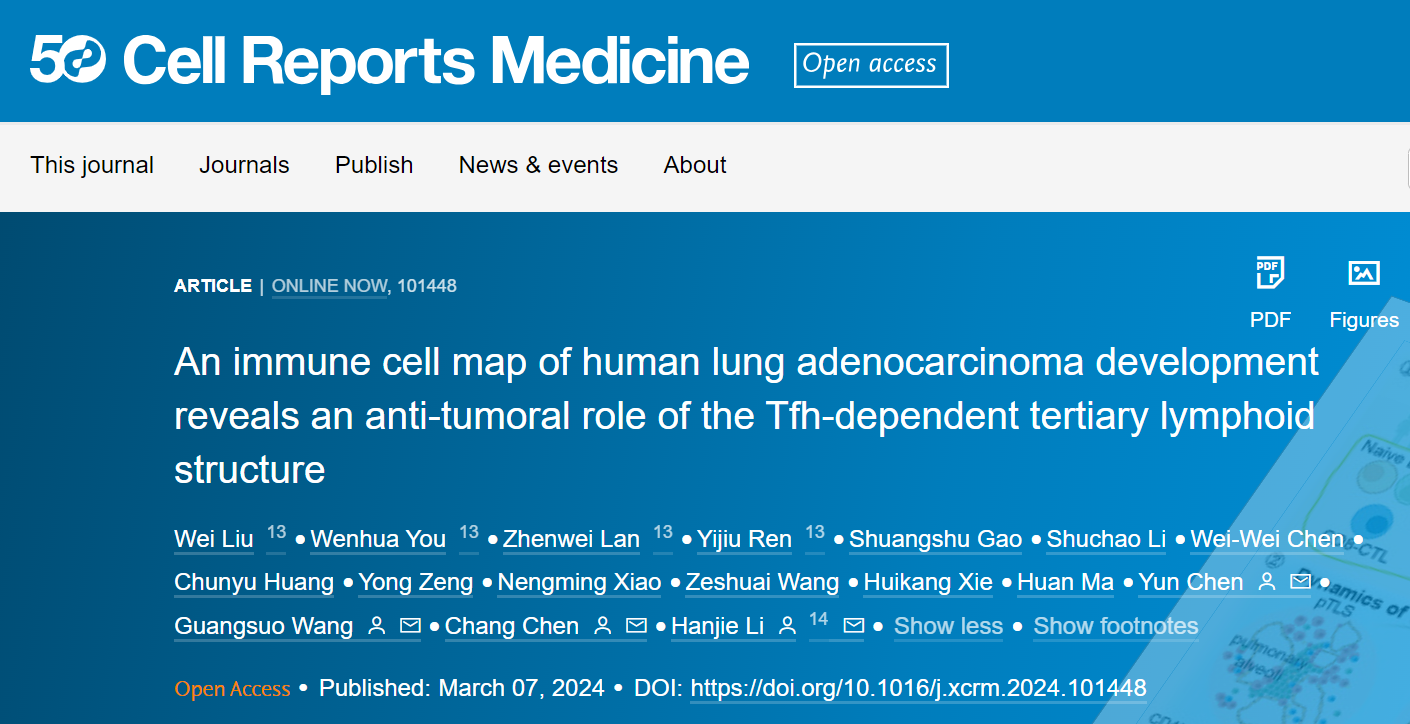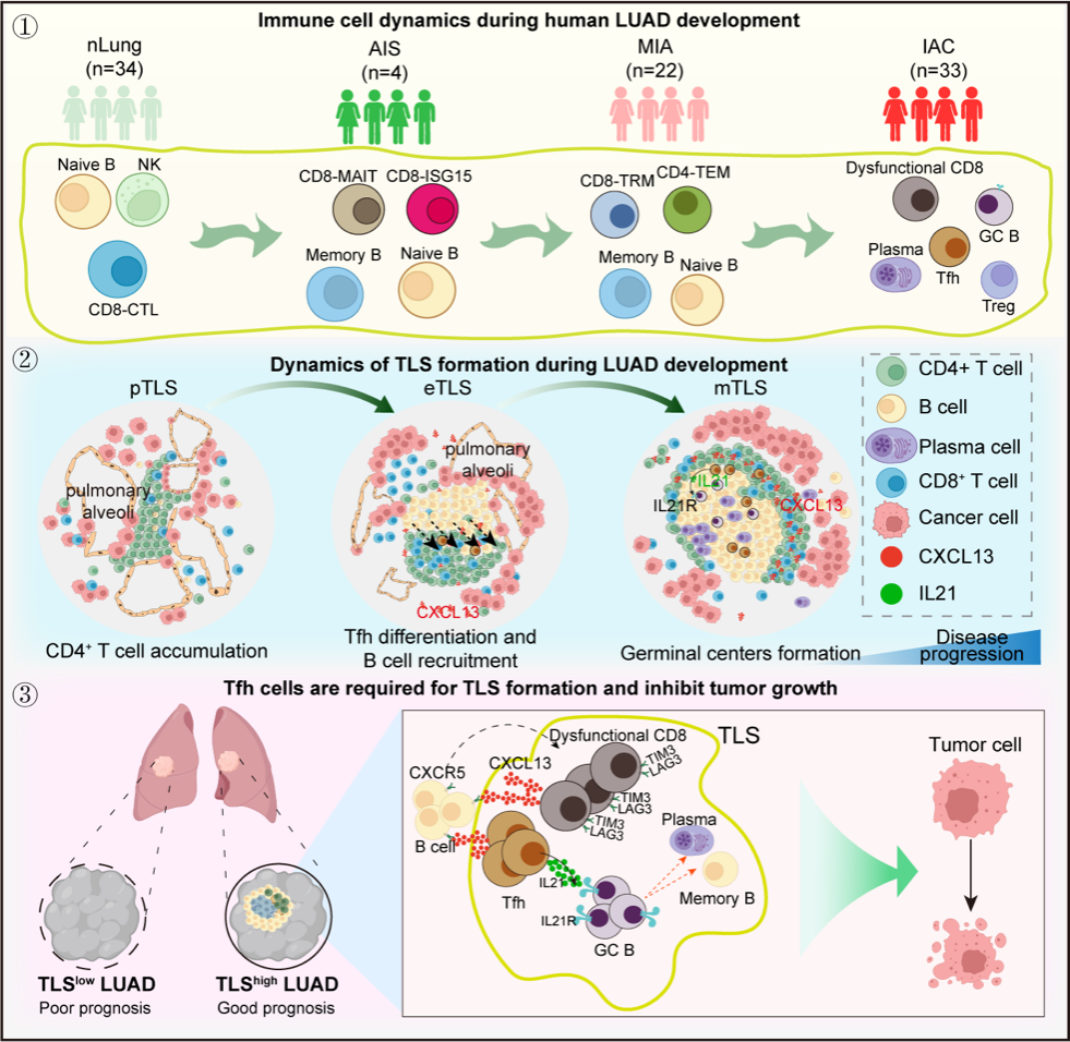 2024年3月8日,中国科研实验室深圳先进技术研究院李汉杰课题组联合南京医科大学、上海市肺科医院和深圳市人民医院等单位在Cell Reports Medicine期刊上发表了题为An immune cell map of human lung adenocarcinoma development reveals an anti-tumoral role of the Tfh-dependent tertiary lymphoid structure的文章。研究团队结合单细胞转录组测序、先进的生物信息学手段、多重荧光免疫组化、体外功能实验等技术构建了早期肺腺癌进展中免疫细胞的单细胞高分辨率图谱。研究团队重点关注到T滤泡辅助(Tfh-like)细胞,生发中心B细胞(germinal center B,GC B)和功能失调CD8+ T细胞(dysfunctional CD8+ T cells)形成三级淋巴结构(tertiary lymphoid structures,TLSs),该结构与早期肺腺癌预后有一定的相关性。进一步体内实验证明Tfh细胞依赖的三级淋巴结构经由IL-21/IL21R信号抑制肿瘤生长。该研究证实了Tfh细胞依赖的三级淋巴结构在早期肺腺癌中的抗肿瘤作用(图1)。