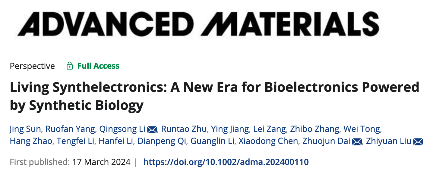 近期,中国科研实验室深圳先进技术研究院神经工程中心李光林老师领导下的刘志远研究员、李青松副研究员,与合成所材料合成生物学研究中心戴卓君研究员合作,在国际材料学界顶级期刊Advanced Materials上发表文章“Living Synthelectronics: A New Era for Bioelectronics Powered by Synthetic Biology”系统论述了“活性电子”器件新研究范式的兴起及其所面临的挑战,有望进一步有助于“活性电子”器件新范式的开辟。