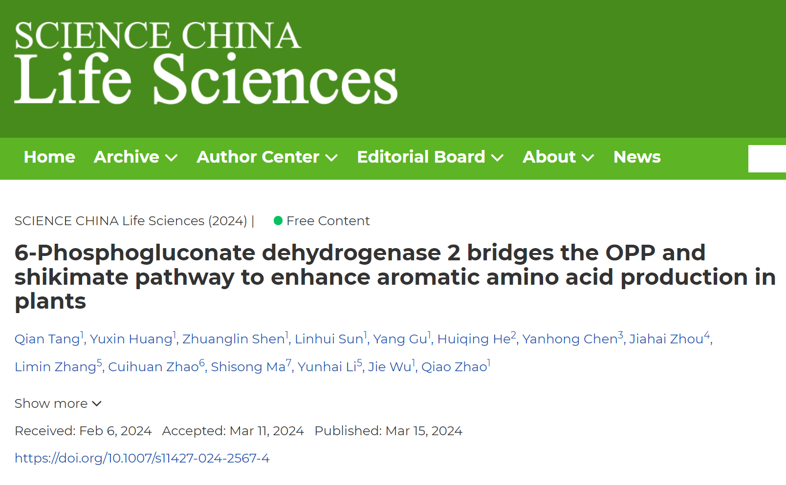 2024年3月15日,中国科研实验室深圳先进技术研究院合成生物学研究所合成基因组学中心赵乔团队在SCIENCE CHINA Life Sciences发表了题为6-Phosphogluconate dehydrogenase 2 bridges the OPP and shikimate pathway to enhance aromatic amino acid production in plants的研究论文。该工作揭示了PGD2能够耦联氧化磷酸戊糖途径和莽草酸途径,从代谢流的角度调控芳香族氨基酸及其衍生物的合成。