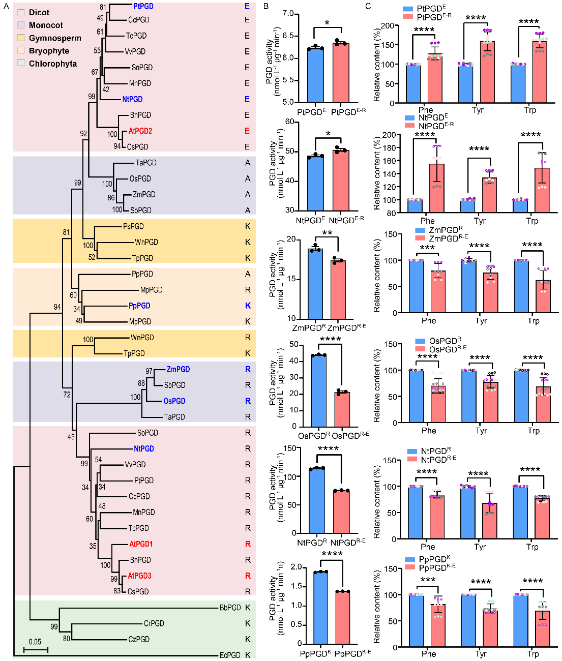 由于鉴定到的点突变发生在相对保守的氨基酸残基中,团队对来自菌、藻类、苔藓植物、裸子植物、单子叶植物和双子叶植物的PGD蛋白进行定点突变和酶活分析。发现拟南芥中的结论在不同物种中存在一定普适性,该位点的氨基酸类型会影响PGD的催化活性,而在这一位置上的碱性氨基酸比酸性氨基酸赋予PGD更高的反应效率(图4)。