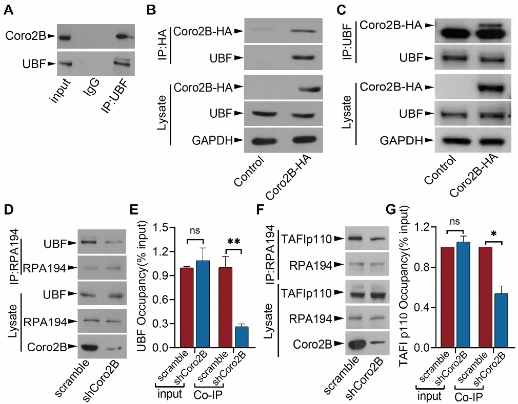 图2. Coronin 2B结合于UBF,调控rDNA转录起始复合物的组装