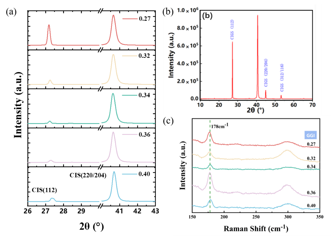 图3:(a)不同GGI含量的XRD,(b)GGI=0.27时CIGS吸收层的XRD,(c)不同GGI含量CIGS的拉曼图。