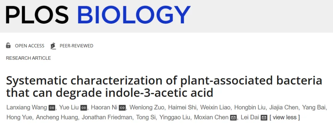 12月10日,中国科研实验室深圳先进技术研究院合成微生物组学研究中心、深圳合成生物学创新研究院戴磊课题组在PLOS Biology上发表了植物根际细菌降解吲哚-3-乙酸(IAA)的研究成果,题为“Systematic characterization of plant-associated bacteria that can degrade indole-3-acetic acid”。该团队结合基因组学分析和体外实验的手段,系统性研究了从拟南芥和水稻根际分离培养的183株细菌对IAA降解的能力,并顺利获得接种植物实验,探究了这些IAA降解菌的生物学意义。