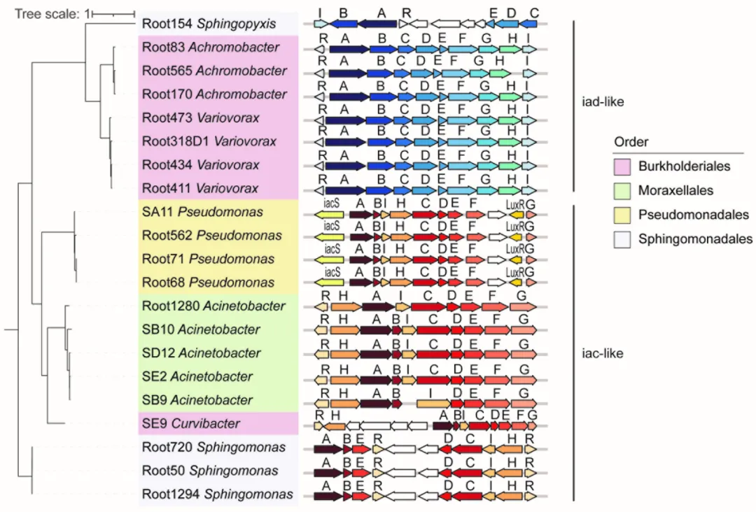 基于这些研究问题,研究团队第一时间运用比较基因组学与体外降解实验相结合的方法,系统性评估了从拟南芥(Arabidopsis thaliana)和水稻(Oryza sativa)根部分离的183株细菌的IAA代谢能力。最终鉴定出来自7个属的共21株细菌具有IAA降解活性,其中包括之前未被报道过的新菌属(图1)。