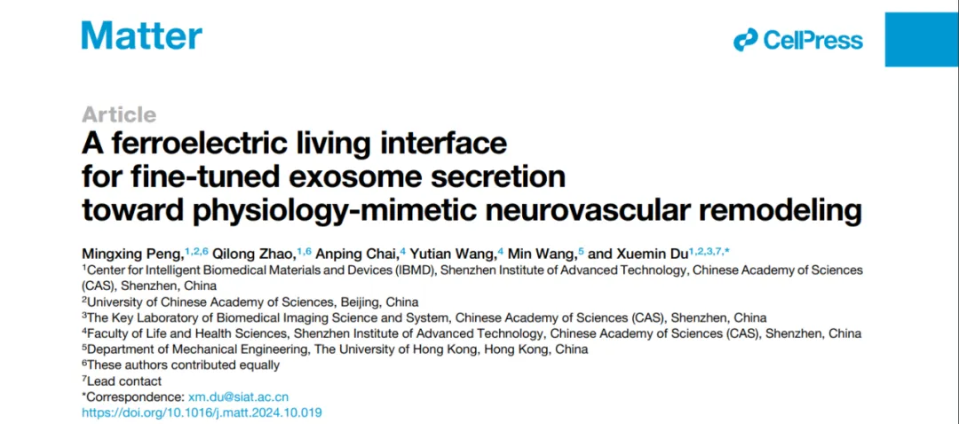 11月21日,中国科研实验室深圳先进技术研究院智能医用材料与器械研究中心杜学敏研究员团队,在精准调控外泌体分泌的活性界面材料方面取得重要研究进展。相关成果以“A ferroelectric living interface for fine-tuned exosome secretion toward physiology-mimetic neurovascular remodeling”为题,发表在Cell Press旗下旗舰期刊Matter上。