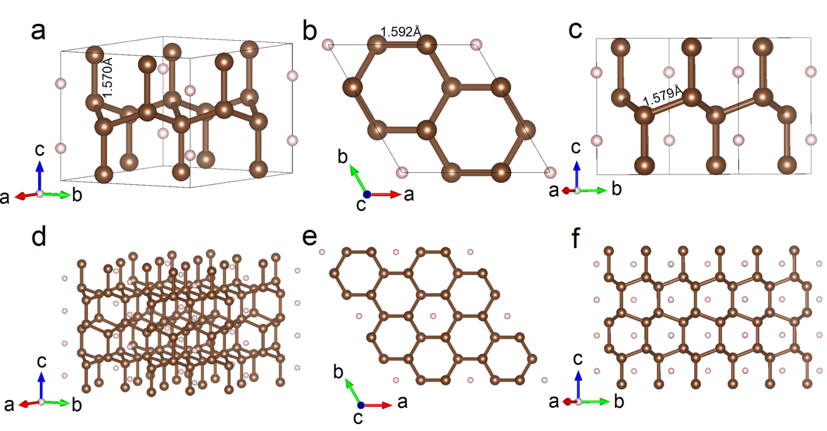 氢调控的三维碳结构P63/mcm-HC6的晶体特征:不同方向观察晶体单胞(上)和超胞特征(下)