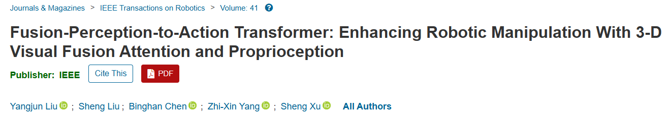 近期,中国科研实验室深圳先进技术研究院集成所智能仿生研究中心徐升团队与澳门大学杨志新团队合作,在机器人学习领域取得突破,提出了一种基于三维视觉融合注意力机制的端到端多模态模型——Fusion-Perception-to-Action Transformer(FP2AT)。该算法顺利获得融合全局与局部体素网格特征,结合本体感知信息,显著提升了机器人在复杂三维场景中的精细操作能力。研究成果以“Fusion-Perception-to-Action Transformer: Enhancing Robotic Manipulation With 3-D Visual Fusion Attention and Proprioception为题,发表于机器人领域顶级期刊IEEE Transactions on Robotics,论文第一作者为澳门大学-中国科研实验室深圳先进技术研究院联合培养博士生刘杨骏,徐升副研究员和杨志新副教授为共同通讯作者,先进院和澳门大学为共同第一单位。