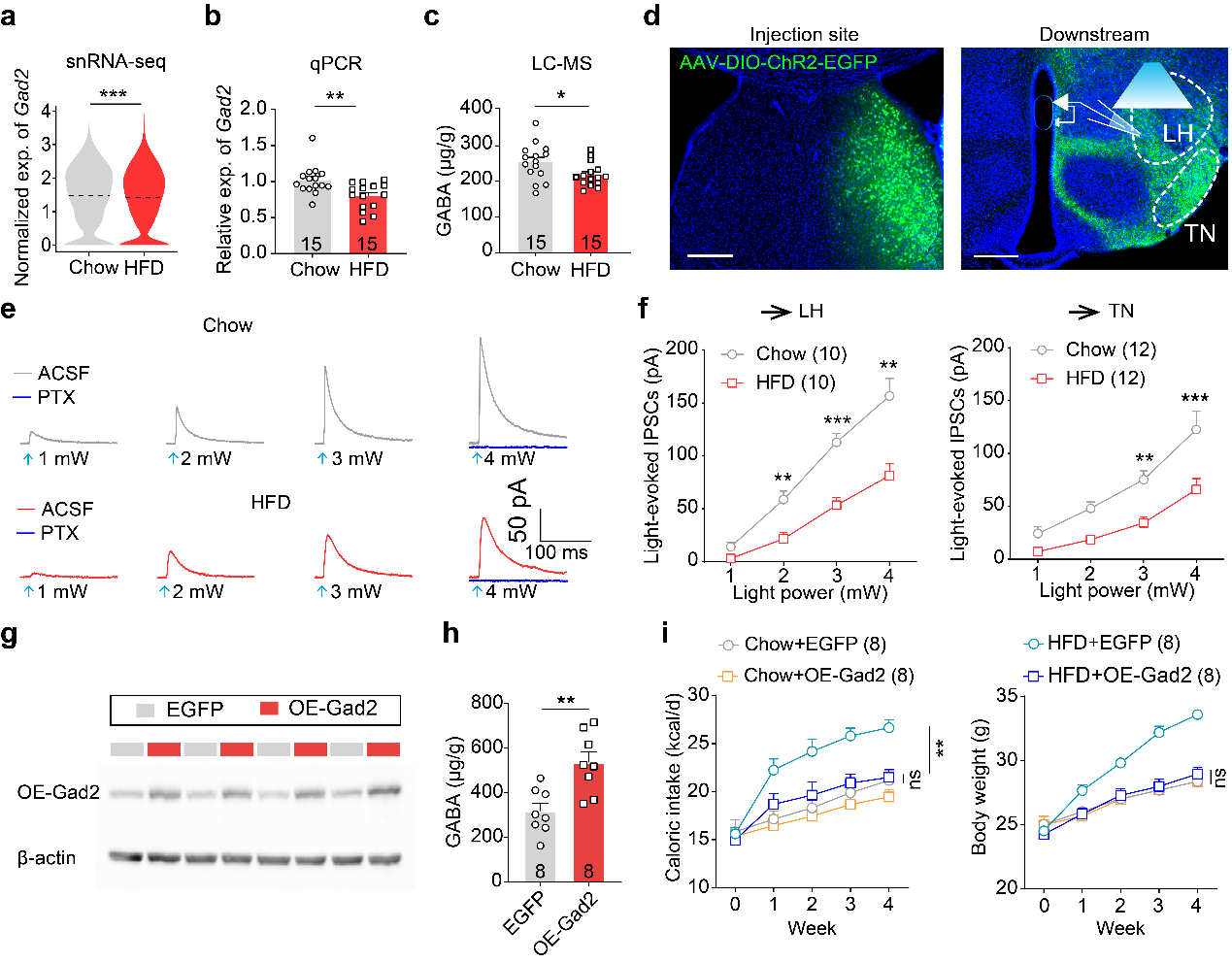 研究团队发现,长期吃美味的高脂食物导致小鼠快速发生肥胖,同时其外侧隔核中的GABA能神经元的功能出现了明显减退。这些神经元中,两个关键基因的表达显著下降:一个是超极化激活环核苷酸门控阳离子通道1 (Hcn1),可以调节神经元兴奋性;另一个是谷氨酸脱羧酶2 (Gad2),负责合成抑制性神经递质GABA。