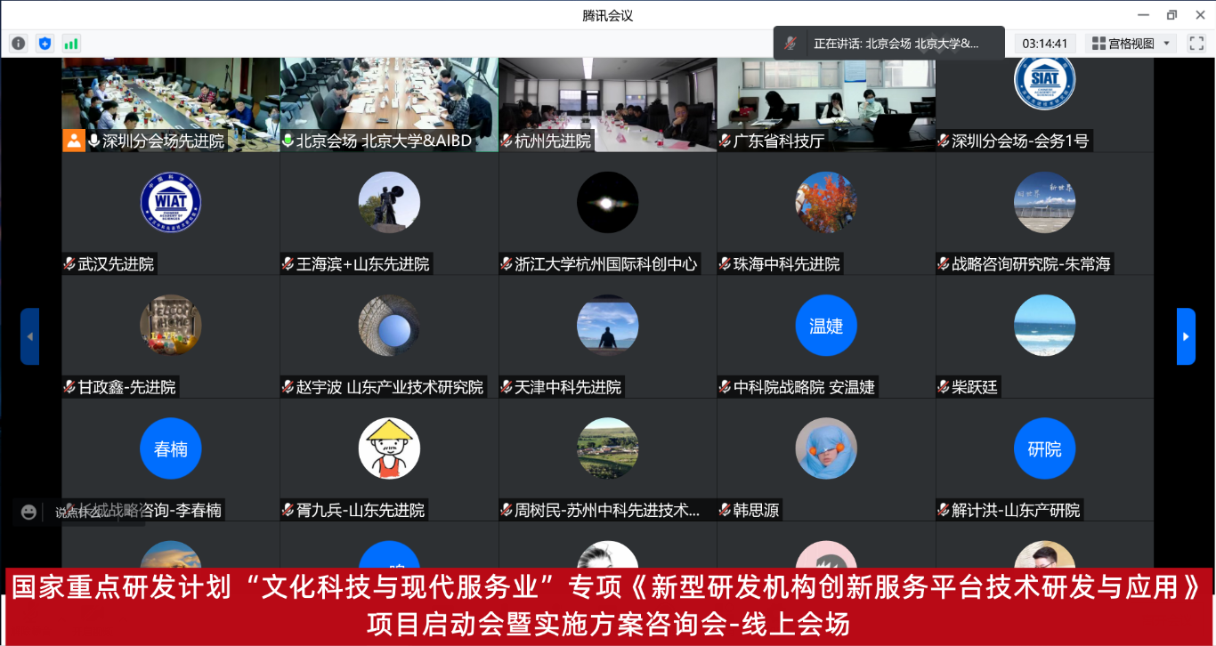 4月15日下午,2021年度国家重点研发计划“文化科技与现代服务业”专项—“新型研发组织创新服务平台技术研发与应用”项目启动会暨实施方案咨询会顺利召开。会议采用线上、线下相结合的方式,其中线下设置中国科研实验室深圳先进技术研究院、北京大数据先进技术研究院两个主要会场,其他各地单位线上参会。清华大学教授柴跃廷、北京大学教授王国成、深圳清华大学研究院副院长刘岩、中科院空天信息创新研究院研究员方震、北京量子研究院研究员常凯共计五位项目咨询专家,以及来自科技部高技术研究开展中心、科技部政策法规与创新体系建设司、科技部火炬中心、广东省科技厅产学研结合处的有关领导和各项目牵头单位、参与单位、外溢组织的单位代表共计100余人出席了会议。会议由凯发k8国际数字所所长李烨主持。