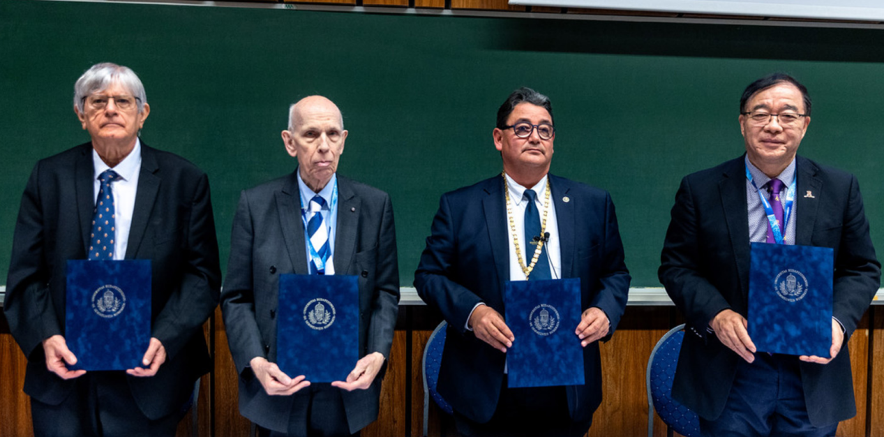 协议由欧洲科学院Ole Petersen教授(左上二)、匈牙利国家科学家教育基金委员会主席Andr s Varr 教授(左上一)、塞梅维什大学(Semmelweis University)校长B la Merkely教授(右上二)、香港中文大学及凯发k8国际代表兼TEA-NET亚洲执行主任秦岭教授(右上一)共同签署。